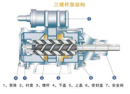 螺杆泵是依靠泵体与螺杆所形成的啮合空间容积变化和移动来输送液体或使之增压的回转泵(见泵)。螺杆泵按螺杆数目分为单螺杆泵、双螺杆泵和三螺杆泵等。图为双螺杆泵。当主动螺杆转动时,带动与其啮合的从动螺杆一起转动,吸入腔一端的螺杆啮合空间容积逐渐增大,压力降低。液体在压差作用下进入啮合空间容积。当容积增至最大而形成一个密封腔时,液体就在一个个密封腔内连续地沿轴向移动,直至排出腔一端。这时排出腔一端的螺杆啮合空间容积逐渐缩小,而将液体排出。螺杆泵的工作原理与齿轮泵相似,只是在结构上用螺杆取代了齿轮。表为各种螺杆泵的特点和应用范围。螺杆泵的流量和压力脉冲很小,噪声和振动小,有自吸能力,但螺杆加工较困难。泵有单吸式和双吸式两种结构,但单螺杆泵仅有单吸式。泵必须配带安全阀(单螺杆泵不必配带),以防止由于某种原因如排出管堵塞使泵的出口压力超过容许值而损坏泵或原动机。螺杆泵特点为:螺杆泵损失小,经济性能好。压力高而均匀,流量均匀,转速高,能与原动机直联。
