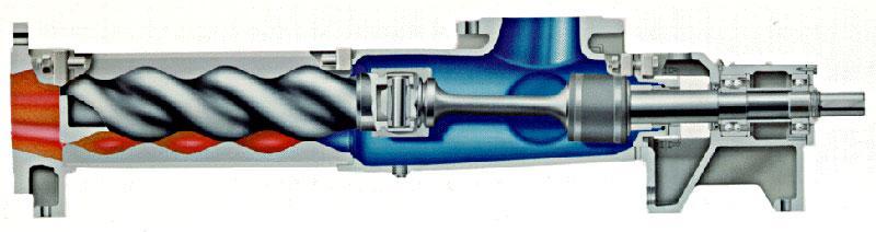 由于各螺杆的相互啮合以及螺杆与衬筒内壁的紧密配合,在泵的吸 入口和排出口之间, 就会被分隔成一个或多个密封空间。随着螺杆的转动和啮合,这些密封空间在泵的吸入端不断形成,将吸入室中的液体封入其中,并自吸入室沿螺杆轴向连续地推移至排出端,将封闭在 各空间中的液体不断排出,犹如一螺母在螺纹回转时被不断 向前推进的情形那样,这就是螺杆泵的基本工作原理。