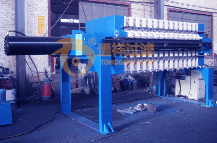 过滤部分是由按一定次序排列在主梁上的滤板、夹在滤板之间的滤布、隔膜滤板组成,滤板、滤布与隔膜滤板的相间排列,形成了若干个独立的过滤单元──滤室过滤开始时,料浆在进料泵的推动下,经止推板上的进料口进入各滤室内,并借进料泵产生的压力进行过滤。由于滤布的作用,使固体留在滤室内形成滤饼,滤液由水嘴